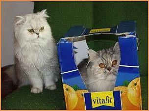 Na zdjęciu kocice p. Jana. Dostały nowe zabawki, ale większym zainteresowaniem obdarzyły pusty karton po soku. Walka o to która z nich wskoczy do środka była popisem kociej gracji i gimnastycznej zwinności, a zakończyła się remisem. Duża i mała kocica do kartonu wcisnęły się razem i zgodnie ucięły sobie drzemkę.